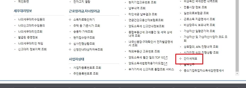2. 상단 메뉴에서 조회/발급 항목을 클릭하면 다양한 서비스 메뉴가 펼쳐집니다. 이곳에서 원하는 메뉴를 찾아볼 수 있으며, 특히 세액표 조회 기능을 통해 근로소득 간이세액표를 빠르게 찾아볼 수 있습니다. 화면을 아래로 스크롤하면서 추가적인 서비스나 혜택도 확인해 보세요. 또한, 세금 관련 문의나 상담이 필요할 때 유용한 정보도 이곳에서 얻을 수 있습니다.