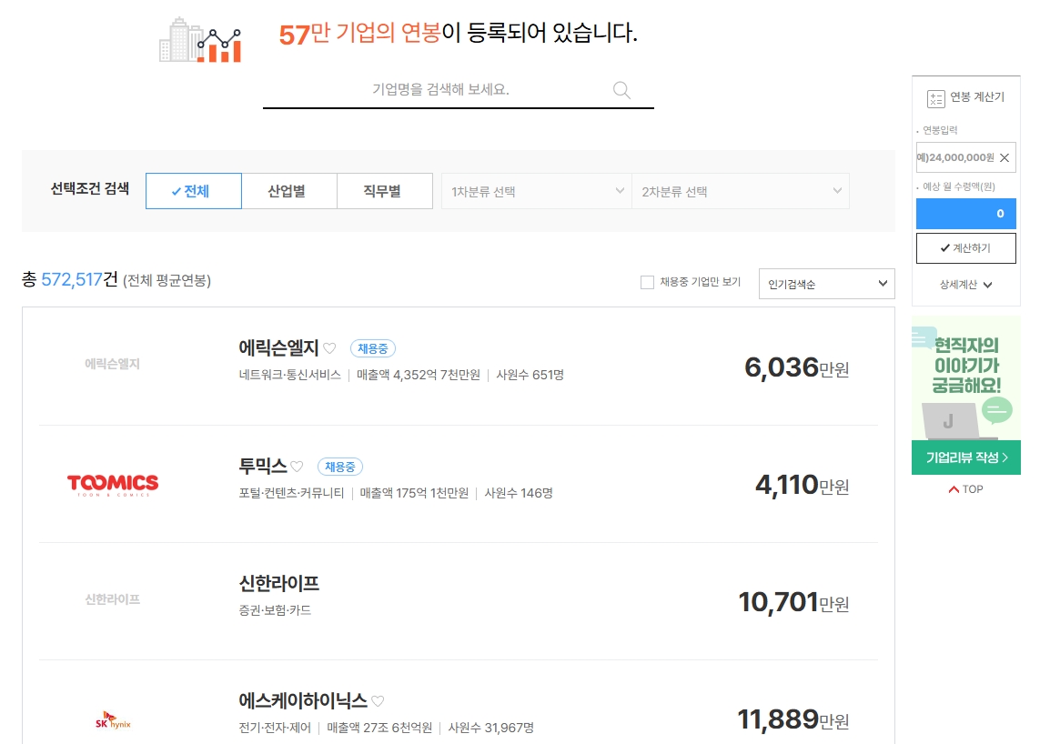 6. 검색 결과에 따르면 약 57만 개의 기업 연봉 데이터가 등록되어 있어, 구직자는 원하는 조건에 맞게 상세한 연봉 비교가 가능합니다. 기업리뷰 기능을 통해 근무 환경과 복지 등도 확인할 수 있어 더욱 효율적인 구직 활동을 지원합니다.