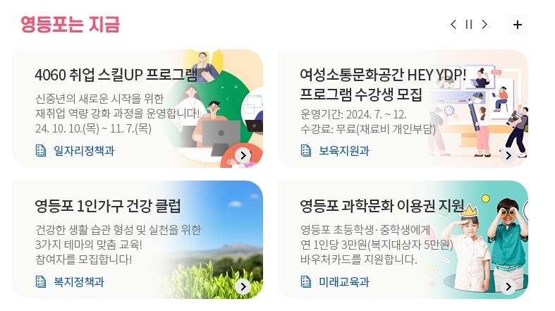 10. 영등포구청 사진관에서는 다양한 행사와 구정 활동 사진을 볼 수 있어요. 영상 콘텐츠를 통해 구정 소식을 쉽게 접할 수 있는 영등포TV도 운영 중입니다.