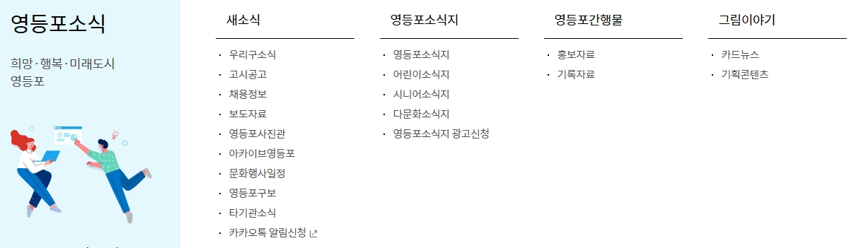 5. 영등포구 소식 공간에서는 최신 공지사항, 보도자료, 채용 정보 등 다양한 소식을 확인할 수 있습니다. 또한, 문화 행사 일정과 타기관 소식까지 한눈에 파악할 수 있어요.