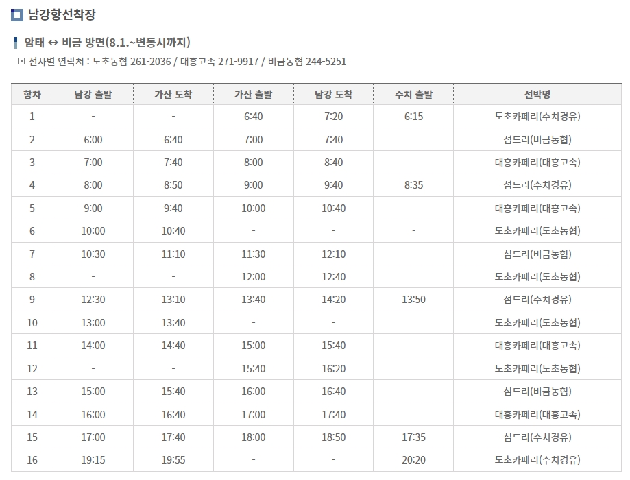 5. 남강에서 가산까지의 야간 배편은 목요일과 금요일에만 운행됩니다. 이 시간표에 따르면 오후 6시 40분부터 자정까지 네 편의 배가 운영되며, 심야시간까지 배를 이용할 수 있어요. 이 코스는 주말 방문객들에게 인기가 많아 예약이 필수인 경우도 있습니다.