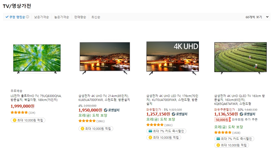 4. TV를 클릭하면 다양한 크기와 브랜드의 제품이 나옵니다. 최근 85인치 모델은 약 200만 원 정도로 형성되어 있으며, 70인치 모델은 125만 원, 65인치는 113만 원에 판매되고 있습니다. 화질과 브랜드에 따라 가격 차이가 있으니 자신에게 맞는 모델을 신중하게 선택하는 것이 좋습니다.