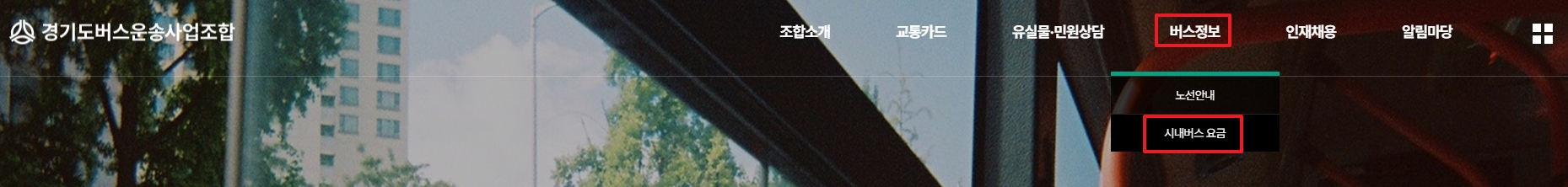2. 상단의 메뉴에서 버스정보 - 시내버스 요금을 클릭합니다. 상단 메뉴에서 버스정보 탭을 선택하고, 이어서 시내버스 요금 항목을 클릭합니다. 이 메뉴에서는 경기도 내에서 운영되는 다양한 버스 유형에 따른 요금 정보를 확인할 수 있습니다. 이를 통해 이용자는 버스 종류에 따른 요금을 미리 확인하여 보다 효율적으로 교통비를 계획할 수 있습니다.