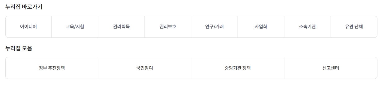 10. 누리집 바로가기 메뉴에서 관련 사이트로 이동합니다. 누리집 바로가기를 통해 특허청과 연관된 다양한 사이트로 바로 이동할 수 있습니다. 정부 추진 정책, 국민 참여, 중앙 기관 정책, 신고센터 등 관련 기관 사이트와 연계하여 사용자의 편의를 높이고 있습니다.
