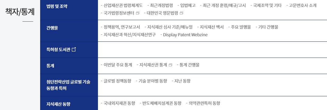 4. 책자/통계 메뉴를 통해 다양한 통계와 보고서를 확인합니다. 산업재산권 법령 및 규제에 관한 자료와 정책 연구 보고서, 주요 통계 정보 등이 제공됩니다. 특허청의 활동과 관련된 다양한 통계를 통해 지식재산의 흐름을 파악하고, 산업의 전반적인 동향을 분석할 수 있습니다.
