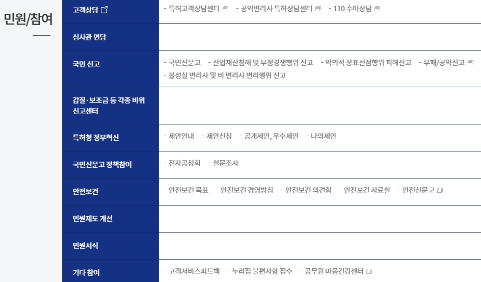 6. 민원/참여 메뉴에서 국민 의견을 수렴합니다. 국민들이 특허청에 대한 민원과 의견을 제시할 수 있는 다양한 방법이 제공됩니다. 제안 안내와 국민신고, 국민참여 정책 등이 포함되어 있어, 국민들이 적극적으로 특허청의 정책과 활동에 참여할 수 있도록 유도합니다.