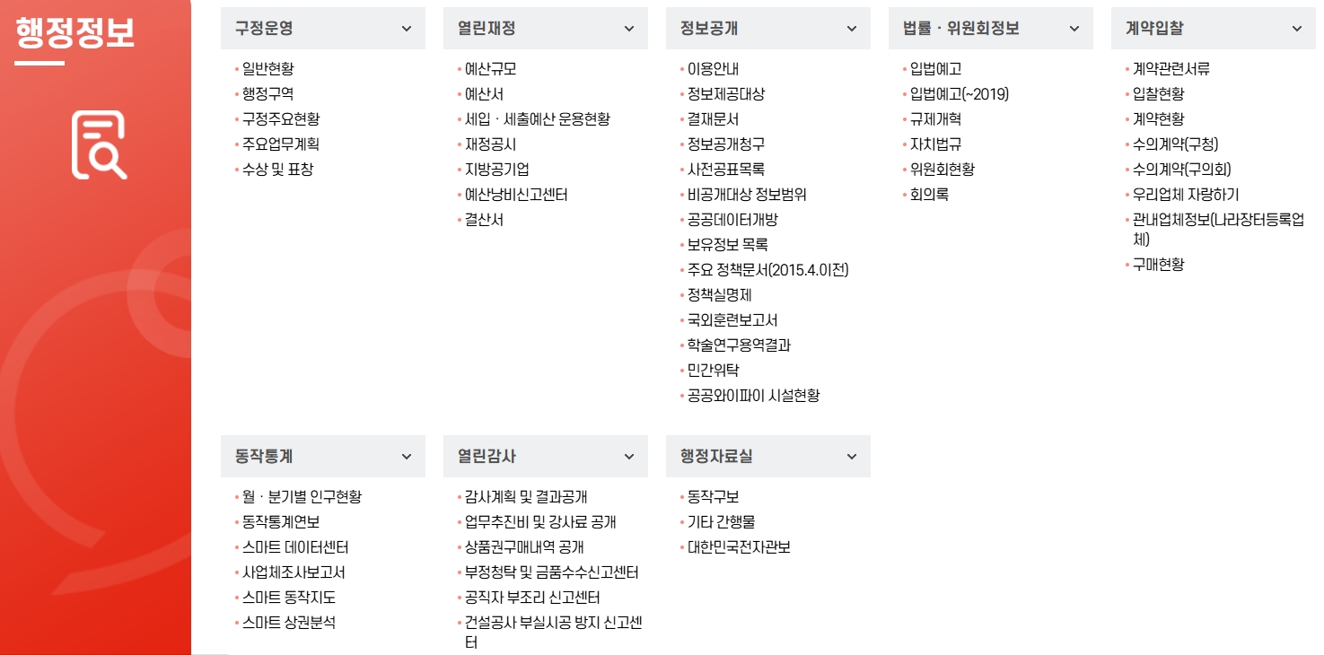 3. 행정 정보 메뉴에서 동작구의 행정 현황을 살펴봅니다. 행정 정보 메뉴에서는 구정 운영, 열린 재정, 정보 공개 등의 정보를 제공합니다. 여기에서는 예산 규모와 재정 운용 현황 등을 자세히 확인할 수 있으며, 공공 데이터 개방과 관련한 정보도 제공되어 행정의 투명성을 높이고 있습니다.