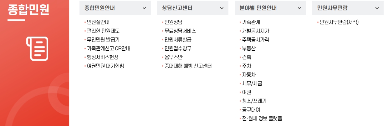 2. 종합민원 서비스를 통해 다양한 민원 정보를 확인합니다. 종합민원 서비스에서는 민원실 안내, 편리한 민원 제도, 가족관계서류 QR 안내 등을 비롯해 민원 전반에 대한 안내를 받을 수 있습니다. 무인 민원 발급기 위치나 행정 서비스 현장 정보도 확인 가능하여 주민들이 더욱 편리하게 서비스를 이용할 수 있습니다.