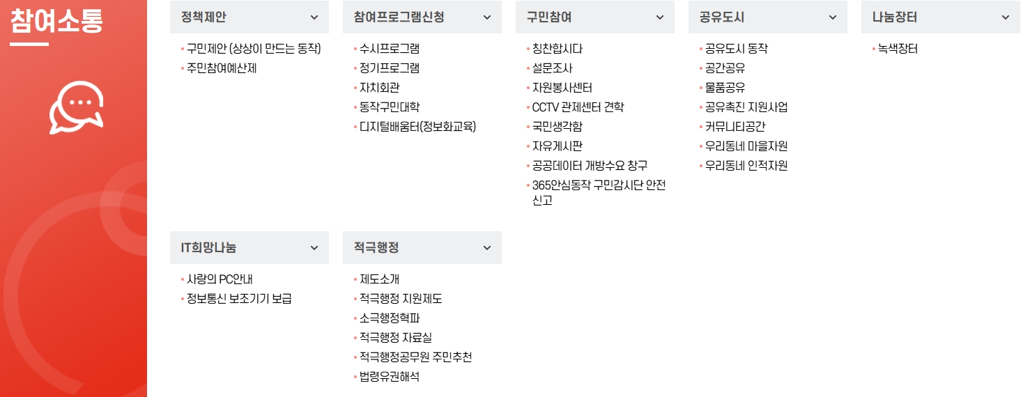 4. 참여 소통 메뉴에서 주민 참여 프로그램을 신청합니다. 주민들은 참여 소통 메뉴를 통해 다양한 프로그램에 참여할 수 있습니다. 예를 들어, 구민 제안, 주민참여 예산제와 같은 프로그램에 참여할 수 있으며, 자원봉사센터 및 설문 조사도 통해 구민 의견을 수렴하여 구정에 반영하고 있습니다.
