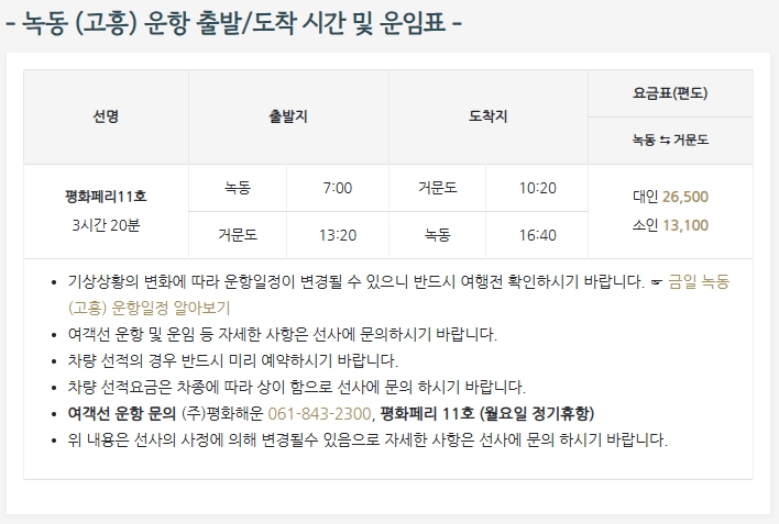 5. 평화페리 11호 운항 시간표 및 요금 확인 평화페리 11호는 녹동에서 거문도를 오가는 배편으로, 녹동에서 오전 7시와 오후 1시 20분에 출발하며 거문도에 각각 오전 10시 20분, 오후 4시 40분에 도착합니다. 요금은 대인 26,500원, 소인 13,100원으로 책정되어 있습니다. 차량 선적이 가능하므로 차량 이용 시 사전 예약이 필요합니다.