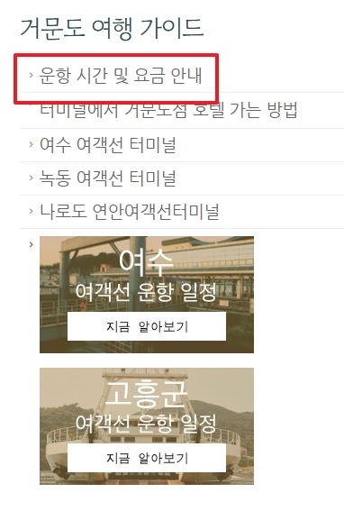 2. 페이지로 이동하면 거문도 여행 가이드 - 운항 시간 및 요금 안내를 클릭합니다. 해당 페이지에서 거문도 여행 가이드 메뉴로 이동하여, 운항 시간과 요금에 대한 상세 정보를 확인합니다. 거문도에 방문하는 사람들을 위해 출발 시간, 도착 시간, 요금 등의 정보가 제공되어 편리한 계획을 세울 수 있습니다.