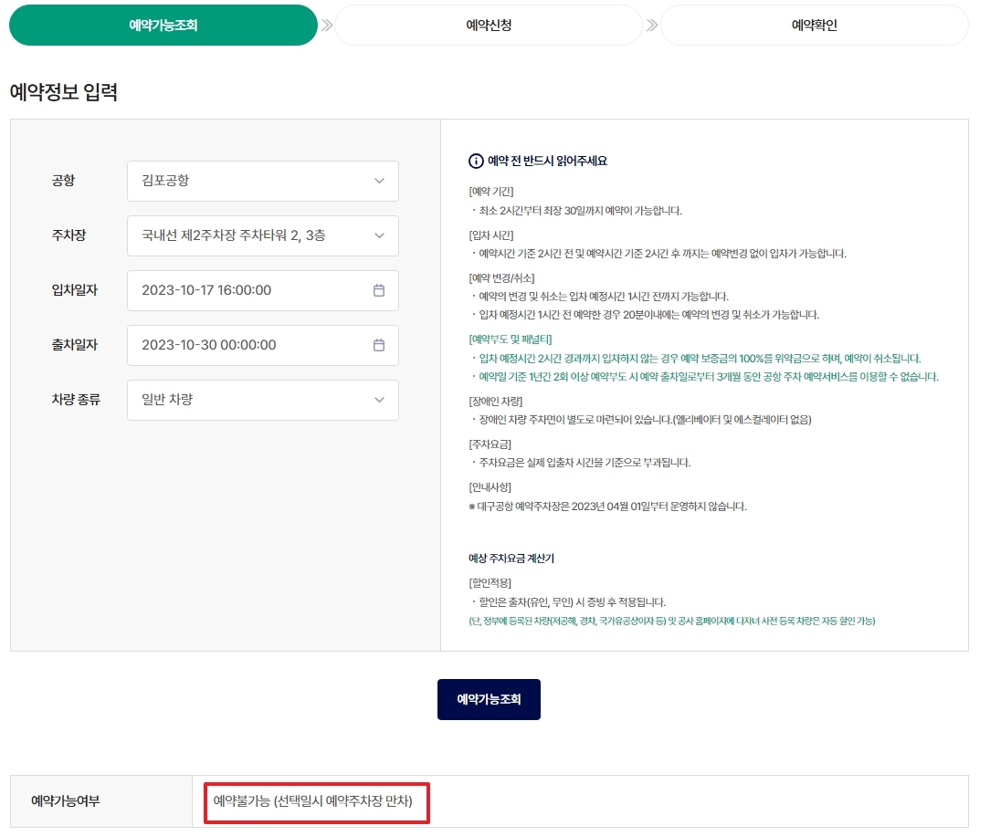 5. 선택한 날짜와 시간대의 예약 가능 여부를 페이지 하단에서 확인할 수 있습니다. 만약 해당 일자에 자리가 없으면 다른 날짜나 시간대를 선택해야 해요. 주차장을 미리 예약해 두면 공항에서의 시간을 절약하고 편안한 마음으로 출발할 수 있답니다. 모든 준비가 잘 갖춰져야 마음 놓고 여행에 집중할 수 있잖아요.