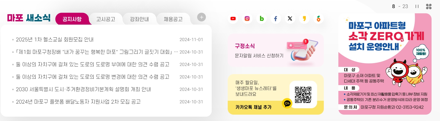 8. 마포구 소식을 확인할 수 있는 페이지로 이동합니다. 공지사항, 고시 공고, 채용 공고, 강좌 안내 등 마포구에서 진행 중인 다양한 소식들이 정리되어 있으며, 최신 뉴스와 중요한 정보들을 한눈에 확인할 수 있습니다. 예를 들어, 구민들을 대상으로 하는 회원 모집 안내나 주요 도로 공사와 관련된 정보들이 상세히 나와 있어, 구민들이 필요한 정보를 빠르게 찾을 수 있습니다.