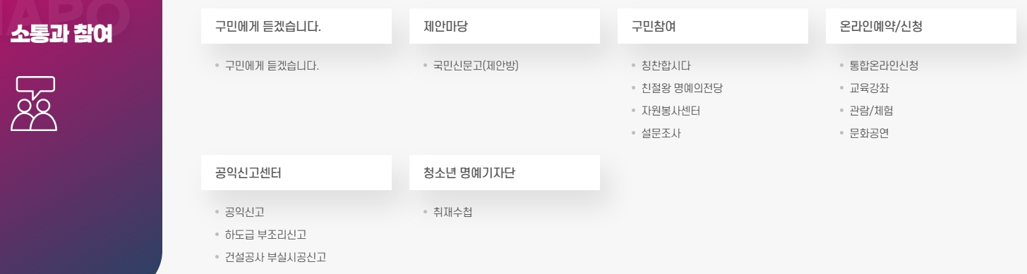 3. 소통과 참여 페이지로 이동합니다. 여기에서는 구민의 의견을 적극적으로 청취하고 반영하는 다양한 채널이 마련되어 있습니다. 구민의 목소리를 듣는 제안마당, 공익신고센터, 청소년 명예 기자단 활동 등이 있으며, 특히 친절 공무원 추천이나 자원봉사센터 설문조사 등을 통해 구민들이 직접 참여하고 소통할 수 있는 기회가 마련되어 있습니다. 온라인 예약/신청 기능을 통해 각종 교육 강좌와 체험, 문화 공연 등의 신청도 가능합니다.