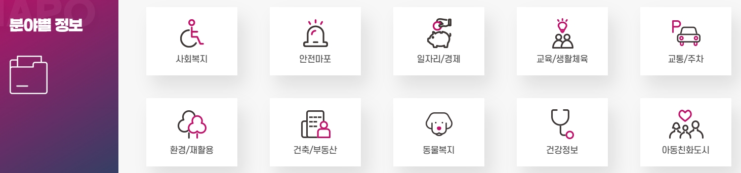 6. 분야별 정보 페이지에서는 사회복지, 안전마포, 일자리 경제, 교육 및 생활체육, 건축/부동산, 교통/주차 등 다양한 카테고리별로 상세한 정보가 제공됩니다. 각 분야에 맞춘 정책과 지원 사항들이 구체적으로 설명되어 있으며, 구민들이 각 분야에서 제공하는 서비스와 정보를 손쉽게 찾을 수 있습니다. 특히 교통 정보나 주차 관련 서비스는 마포구 내 이동과 관련된 정보로 자주 활용됩니다.