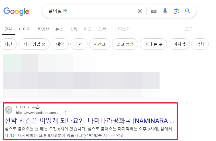 1. 구글에서 남이섬 배 시간표를 검색하여 정보를 확인할 수 있는 페이지로 이동합니다. 공식 홈페이지는 아니지만, 운행 시간과 간격 등의 유용한 정보를 제공하는 페이지가 검색됩니다. 남이섬은 한국의 인기 관광지 중 하나로, 섬으로 들어가려면 배를 타고 이동해야 합니다. 특히 남이섬은 계절에 따라 운행 시간과 배차 간격이 달라지므로, 방문 전에 시간표를 확인하는 것이 중요합니다.