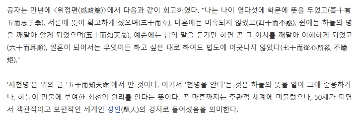 2. 지천명이라는 단어를 검색해본 결과, 이 단어는 하늘의 명을 알았다는 뜻으로, 나이 50세를 비유적으로 이르는 말로 정의됩니다. 이 표현은 단순히 나이를 나타내는 것이 아니라, 50세가 되면서 비로소 인생의 깊은 의미와 자신에게 주어진 사명감을 깨닫게 되는 시기라는 철학적인 의미를 담고 있습니다. 공자가 논어에서 언급한 지천명은 나이 50을 맞이하며 자신이 속한 우주와 사회 속에서의 역할과 목적을 이해하게 되는 것을 의미합니다. 동양 철학에서는 이를 인생의 전환점으로 보아, 단순히 연령을 나타내는 숫자가 아니라, 삶의 깊이를 깨닫고 내면의 성숙함에 도달하는 중요한 시기라고 간주합니다.