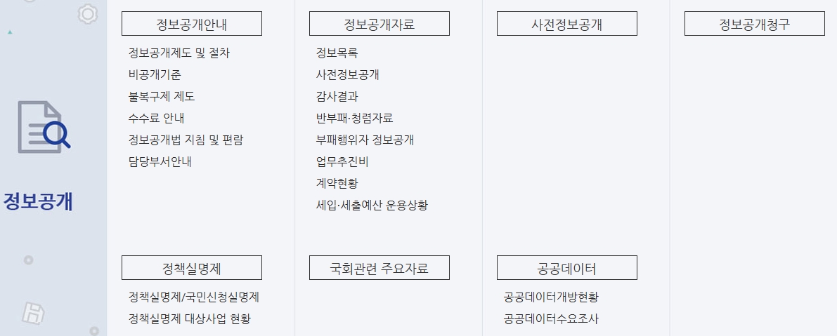 3. 홈페이지 내에서 ‘정보공개’ 섹션을 통해 정부의 정책 자료와 예산 정보를 열람할 수 있습니다. 이곳에서는 정보공개제도에 대한 안내뿐만 아니라, 비공개 기준, 수수료 안내, 정책 실명제 등의 내용도 자세히 제공하고 있어 정책과 관련된 투명성을 높이는 데 기여하고 있습니다.