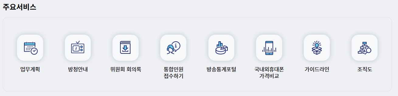 8. 국민이 자주 이용하는 주요 서비스는 ‘주요서비스’ 섹션에서 편리하게 접근할 수 있습니다. 여기에는 업무계획, 방청 안내, 위원회 회의록, 통합민원 접수, 방송통계포털, 가이드라인, 조직도 등 다양한 정보가 포함되어 있습니다. 특히, 국내외 휴대폰 가격 비교와 같은 실생활에 밀접한 정보가 있어 국민들의 생활 편의를 높이는 데 기여하고 있습니다.