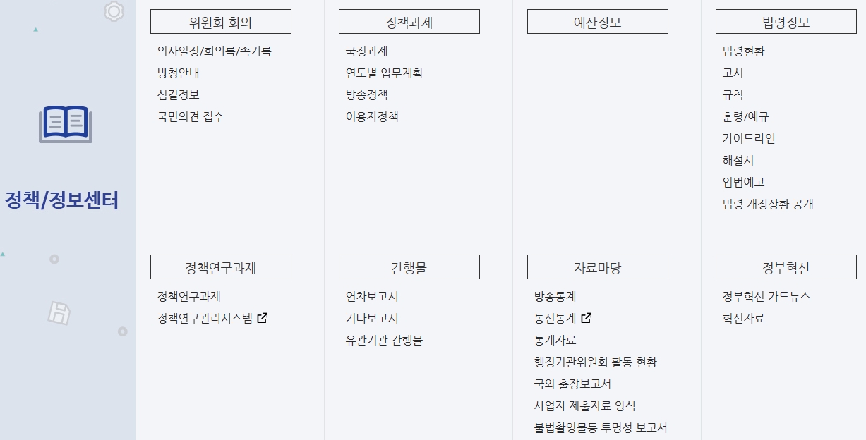 5. 국민들이 필요로 하는 다양한 정보를 ‘정책/정보센터’에서 확인할 수 있습니다. 여기에서는 정책과 관련된 다양한 자료, 회의록, 법령 정보 등을 제공하며, 정책연구 과제 및 예산 현황도 공개하고 있습니다. 이러한 정보는 국민들이 정책의 진행 상황을 보다 쉽게 이해할 수 있도록 돕습니다.