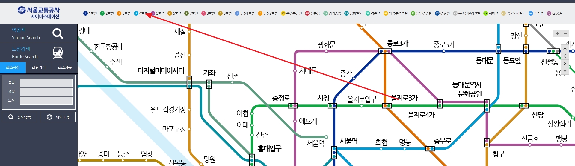 3. 서울 지하철 4호선을 선택하고 나면 노선도를 더욱 자세히 볼 수 있는 옵션이 나옵니다. 노선도에는 각 역의 위치와 지하철이 지나가는 노선을 시각적으로 한눈에 파악할 수 있게 되어 있습니다. 예를 들어, 출발역과 도착역을 설정하면 해당 경로의 소요 시간과 환승 정보까지 빠르게 확인할 수 있습니다.
