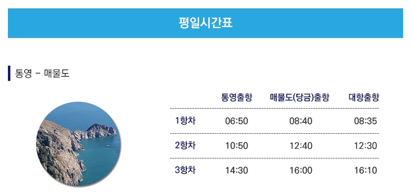 주중 운항 시간표를 살펴보면, 첫 항차는 통영에서 06:55에 출발해 욕지도에 08:30, 우도에 08:50, 연화도에 09:00에 도착합니다. 두 번째 항차는 통영에서 11:00에 출발하며 욕지도에는 13:00, 우도에는 12:10, 연화도에는 13:25에 도착합니다. 마지막 세 번째 항차는 통영에서 15:00에 출발해 욕지도에 16:30, 우도에 16:55, 연화도에 17:05에 도착합니다.
