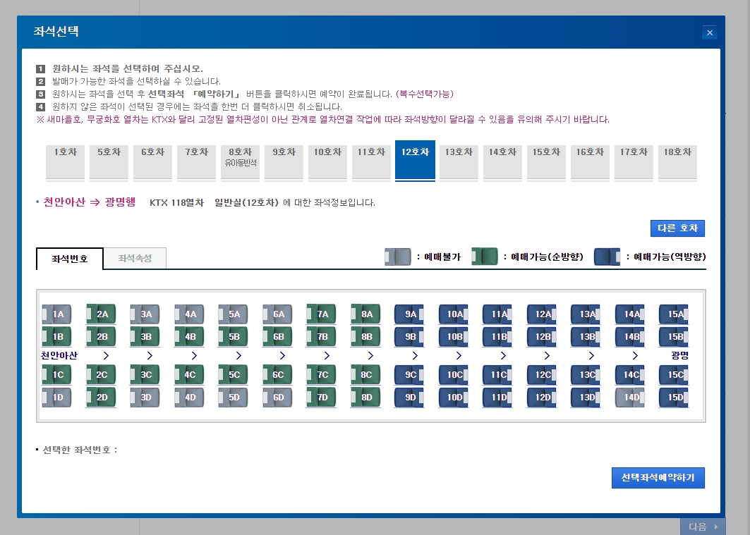 11. 예매를 진행할 때 예매 버튼 또는 좌석 선택 버튼을 클릭하면, 원하는 좌석을 미리 선택할 수 있습니다. 좌석 선택 기능은 기차 여행의 편안함을 고려할 때 유용하며, 본인이 선호하는 위치를 지정할 수 있습니다.