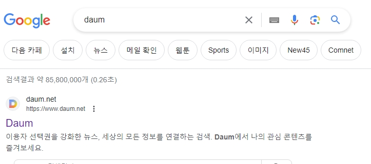 4. 검색 엔진에 따라 다소 차이가 있지만, 구글에서는 ‘다음’보다는 ‘daum’이라고 입력해야 정확한 결과가 나옵니다. 네이버나 줌 등의 포털은 ‘다음’만 입력해도 사이트로 이동할 수 있는 링크를 쉽게 찾을 수 있어요. 각 검색 엔진마다 차이가 있으니 원하는 결과를 얻기 위해 맞는 키워드를 입력해 보세요.