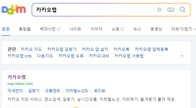 1. 카카오맵에 접속합니다. 검색창에 ‘카카오맵’을 입력하고 사이트로 이동하면, 지도를 통해 다양한 기능을 바로 활용할 수 있습니다. 카카오맵은 도로, 교통, 대중교통 정보뿐 아니라 거리 재기 기능도 지원하여 편리하게 거리를 측정할 수 있습니다.