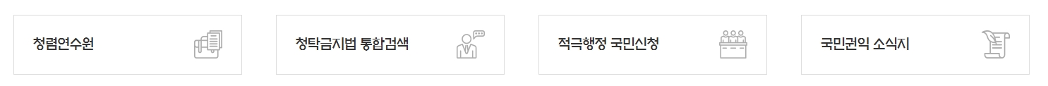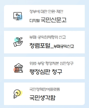 10. 디지털 국민신문고, 청렴포털, 행정심판 청구, 국민생각함과 같은 바로가기 링크들이 제공되어 국민이 필요한 서비스에 쉽게 접근할 수 있도록 돕고 있습니다.
