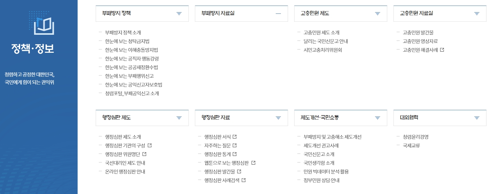 2. 홈페이지의 정책·정보 섹션에서는 부패방지 정책과 관련 법률을 확인할 수 있으며, 다양한 부패 방지 자료와 부패 신고 절차에 대한 정보도 제공됩니다. 청탁금지법과 공직자 행동강령 등 관련 법령도 자세히 설명되어 있습니다.