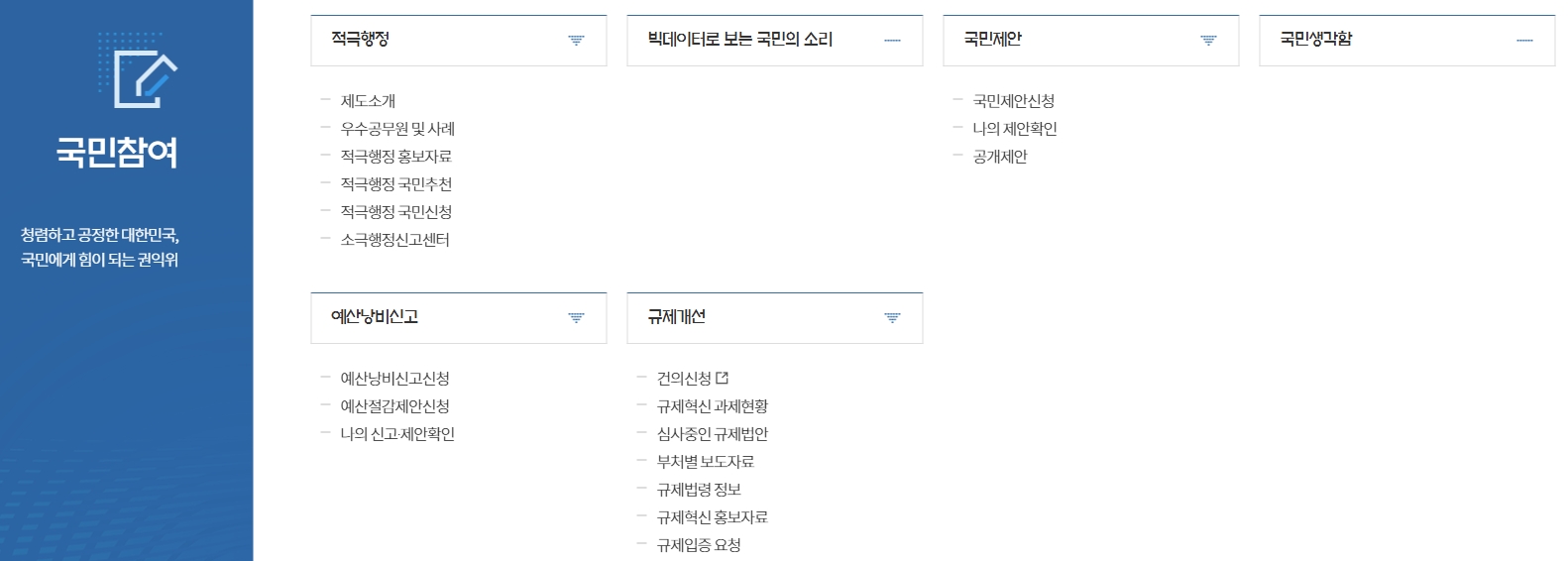 5. 국민참여 섹션에서는 국민들이 직접 제도 개선을 제안하거나 다양한 의견을 제출할 수 있는 기능을 제공합니다. 국민의 의견을 반영한 제도 개선 사례와 빅데이터 분석 자료도 제공됩니다.
