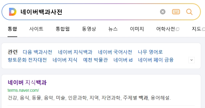 1. 네이버 백과사전으로 들어갑니다. 네이버 백과사전은 한국어, 한자, 외국어 등 다양한 언어와 관련된 풍부한 정보를 제공하며, 주제별로 정리된 자료를 통해 사용자들이 원하는 정보에 빠르게 접근할 수 있습니다. 건강, 인문과학, 자연과학, 경제 등 여러 분야에 걸쳐 정보가 있어 학습에 유용하게 활용할 수 있습니다.
