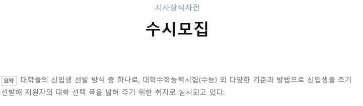 이처럼 수시는 특정 상황에 구애받지 않고 유연하게 대처하는 의미로 쓰이며, 입시에서는 정시와 대비되는 개념으로 활용되고, 일반적으로는 필요에 따라 언제든지 상황에 맞게 대응한다는 뜻으로 널리 사용됩니다.