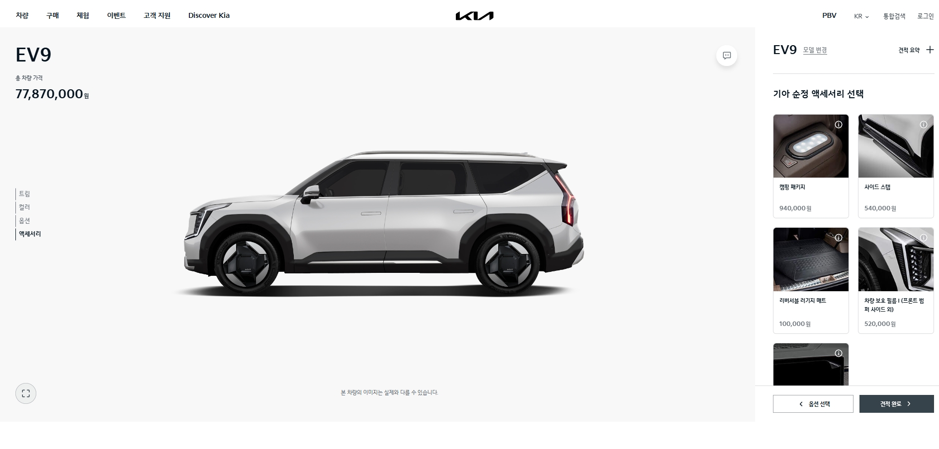 11. EV9의 최종 견적 페이지에서는 차량 가격, 선택한 트림과 옵션, 색상 및 액세서리의 총 금액을 확인할 수 있습니다. 사용자 맞춤형 차량 구성이 완료되며, 총 견적 금액이 표시됩니다. 구매 상담 신청과 시승 신청 버튼을 통해 구매 과정을 더욱 원활하게 진행할 수 있습니다.