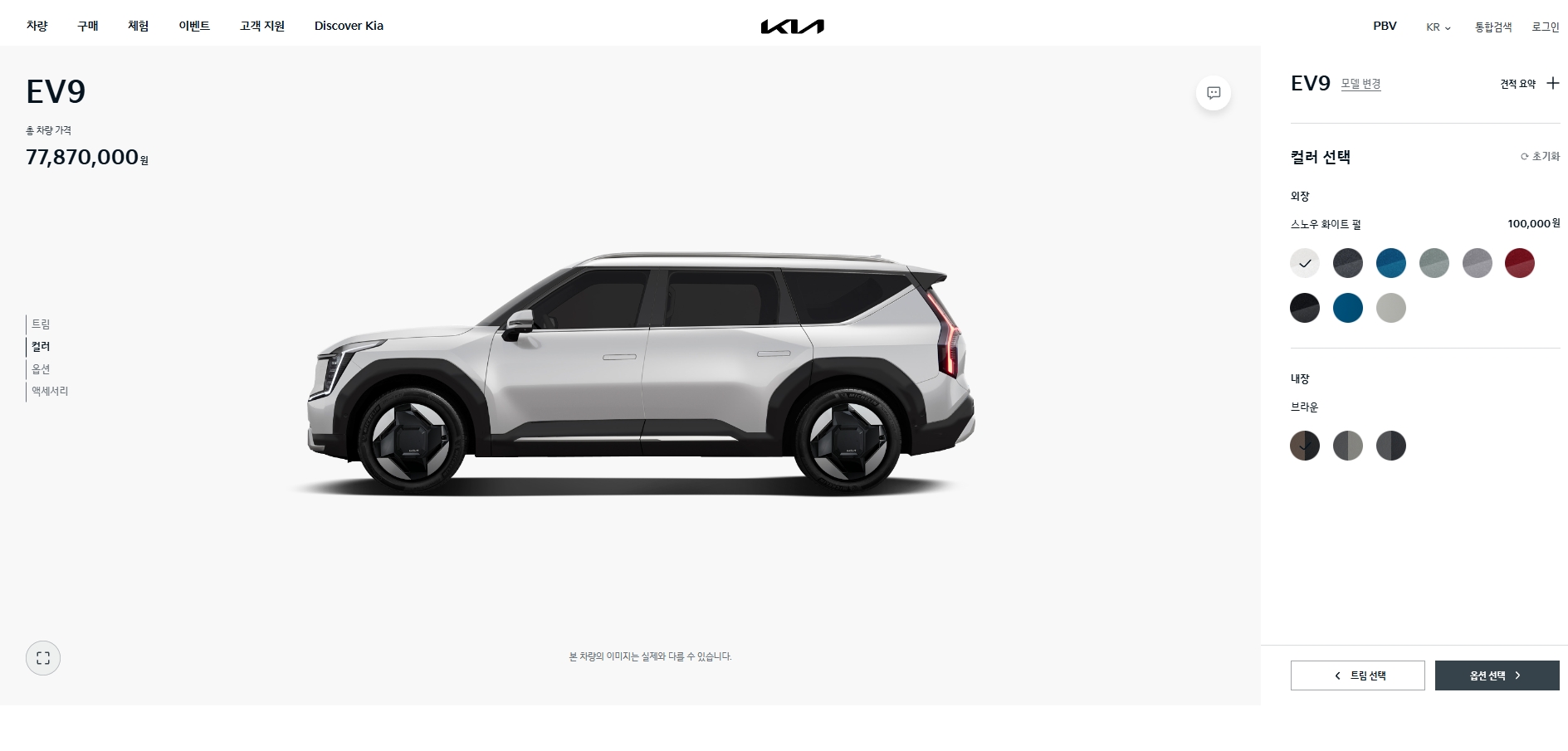 10. EV9의 모의 견적 페이지에서는 사용자가 원하는 트림과 옵션을 선택하여 차량의 구성을 맞출 수 있습니다. ‘에어’와 ‘어스’라는 두 가지 트림이 제공되며, 각각 77,770,000원과 82,820,000원의 가격으로 선택 가능합니다. 또한 6인승과 7인승 중 선택할 수 있어, 가족 구성원 수에 맞게 구성할 수 있습니다.
