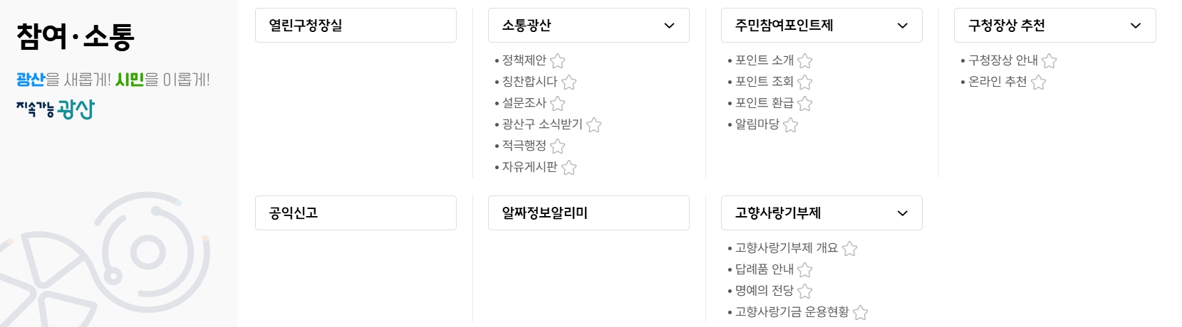 9. 마지막으로 광산구 서비스 페이지를 확인합니다. 주민참여포인트제, 공원 예약, 소식받기, 대형폐기물 배출 등 다양한 서비스가 포함되어 있습니다. 이 섹션은 주민들의 생활 편의를 위한 맞춤형 서비스를 소개합니다.