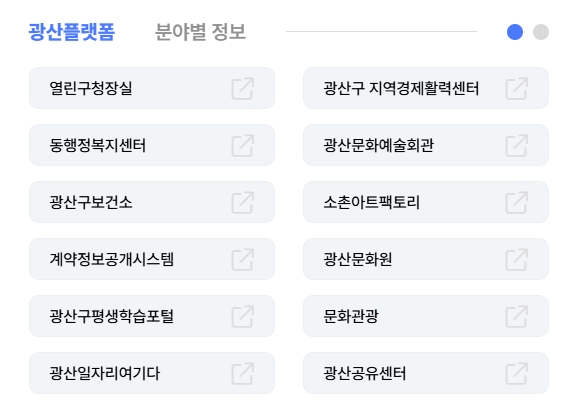 7. 광산플랫폼 항목을 살펴봅니다. 이 항목은 주민들의 편의를 위해 열린 구청장실, 동행정복지센터, 광산구 보건소 등 다양한 관련 센터로의 접근을 지원합니다. 지역 경제 활성화와 문화 예술 발전을 위한 플랫폼들도 소개됩니다.