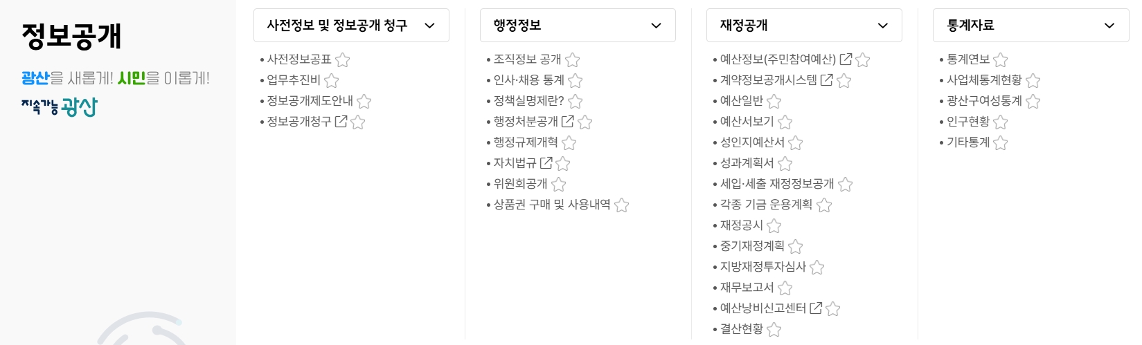 5. 정보공개 페이지로 접속합니다. 이 페이지는 사전정보 공개 및 정보공개 청구 서비스를 제공하며, 주민들이 행정 정보, 재정 공개, 통계 자료 등의 항목을 손쉽게 열람할 수 있도록 구성되어 있습니다. 예산 정보나 계약 정보 공개 시스템도 이곳에서 접근 가능합니다.