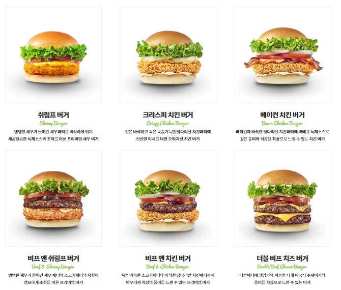7. 쉬림프 버거는 통새우를 사용한 패티와 시그니처 타르타르 소스가 결합된 해산물 버거입니다. 새우의 탱글한 식감과 바삭한 튀김 옷이 신선한 야채와 함께 어우러져 산뜻한 맛을 제공합니다.