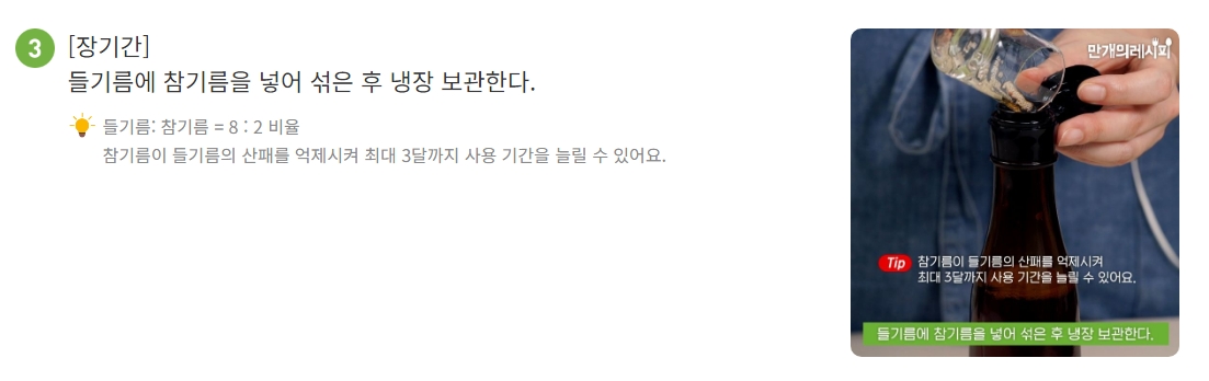 2. 들기름 보관을 검색하고, 검색 결과에서 적합한 글을 선택합니다. 이 글에서는 들기름을 변질 없이 신선하게 유지할 수 있는 다양한 보관법을 제안합니다. 특히, 들기름이 빛과 공기에 민감한 특성을 가지고 있다는 점을 강조합니다.