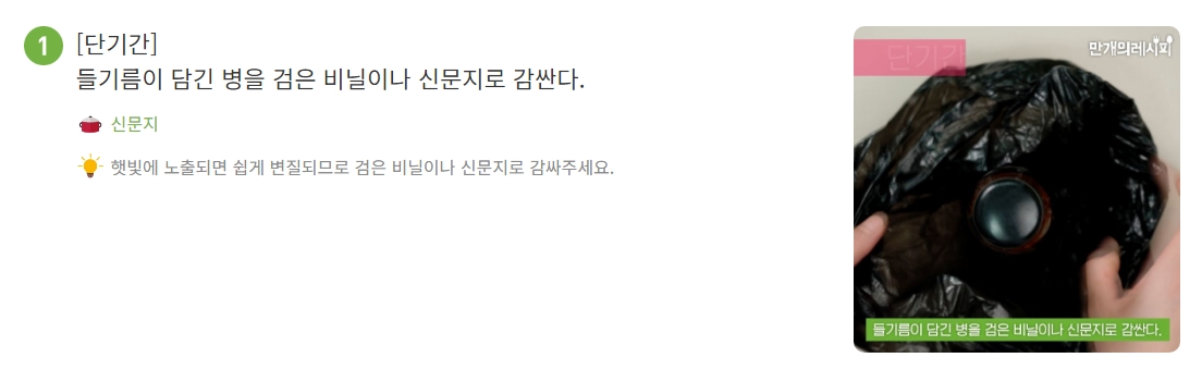 3. 단기간 보관할 때는 들기름 병을 검은 비닐봉지나 신문지로 감싸 빛을 차단하는 것이 효과적입니다. 빛에 의해 촉진되는 산화를 방지하여 들기름의 신선도를 유지할 수 있으며, 이는 간단하면서도 실효성이 높은 방법입니다.