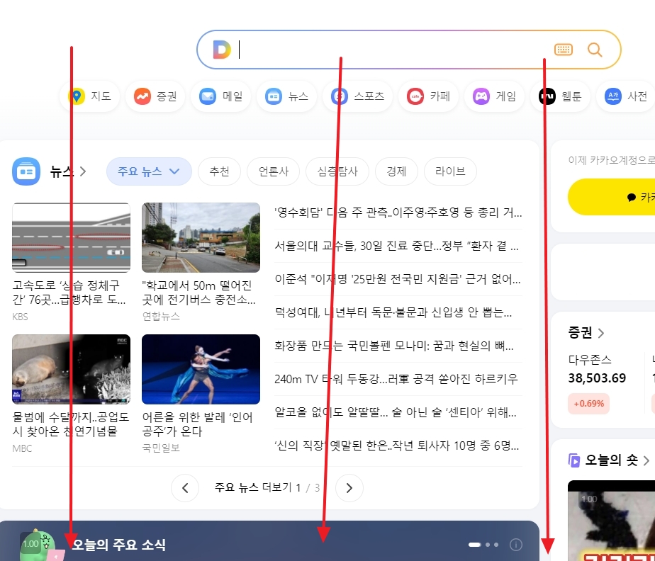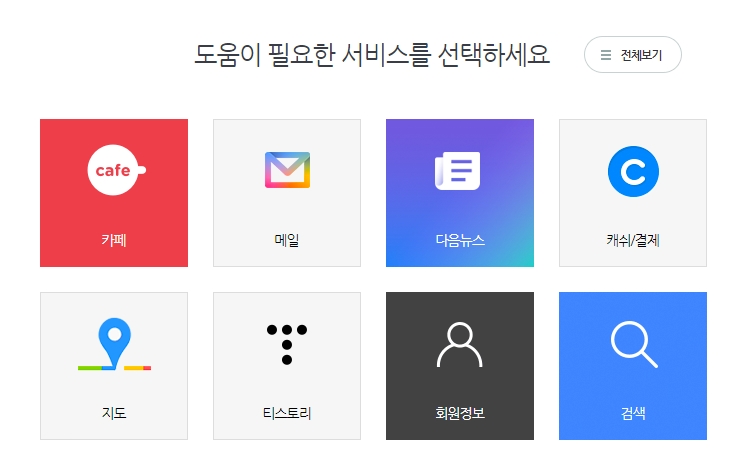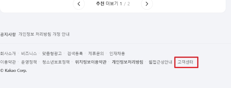 다음 홈페이지의 메인화면에서 스크롤을 아래로 내려 고객센터 메뉴를 찾아 클릭합니다. 이 메뉴를 통해 다음의 고객지원 서비스에 접근할 수 있습니다.