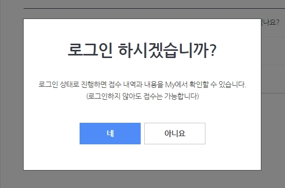 문의하기를 클릭하면 로그인을 하시겠습니까?라는 질문이 나타납니다. 처음에는 로그인이 필요한 것처럼 보일 수 있지만, 아니요를 클릭하면 로그인하지 않고도 문의 접수가 가능합니다. 이는 설명을 자세히 읽으면 확인할 수 있습니다.