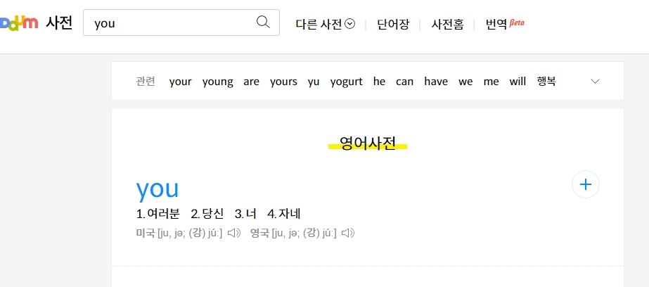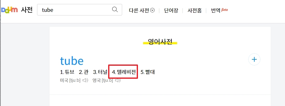 2. 다음 사전 서비스에 접속하여 YouTube라는 단어의 정의와 유래를 확인합니다. 사전에서는 YouTube의 명칭이 너의 텔레비전을 의미하며, 이는 사용자가 직접 동영상을 제작하고 공유할 수 있는 개인 방송 플랫폼이라는 아이디어를 담고 있다고 설명합니다.