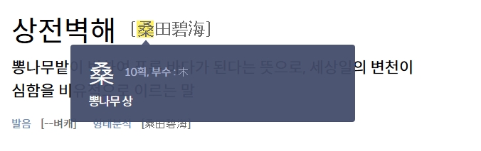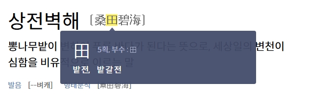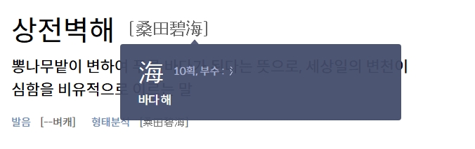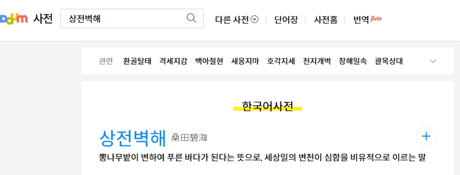 2. 상전벽해라는 단어를 검색합니다. 상전벽해는 뽕나무밭이 변하여 푸른 바다가 된다는 의미로, 세상일의 변화가 매우 심함을 비유적으로 이르는 말입니다. 이 사자성어는 주로 변화의 엄청난 크기와 속도를 묘사할 때 사용됩니다.