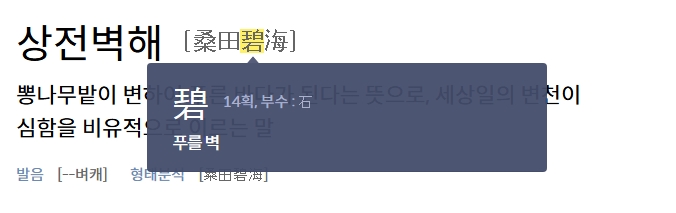 5. 세 번째 한자인 벽(碧)은 푸른색 또는 청록색을 의미합니다. 14획으로 구성된 이 글자는 맑고 깊은 바다색을 연상케 하며, 상전벽해에서 변화 후의 푸른 바다를 나타냅니다.