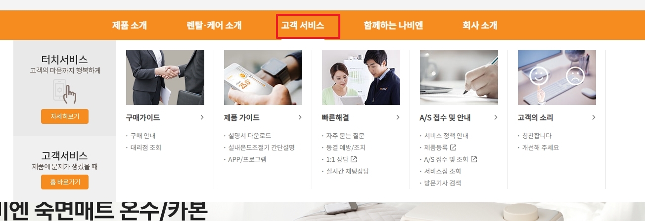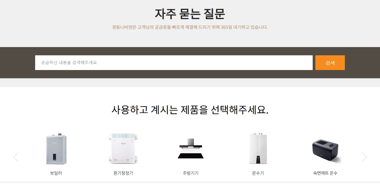 2. 상단 메뉴 중 고객 서비스를 클릭합니다. 고객 서비스 섹션에서는 경동나비엔 제품의 사용 가이드, AS 관련 정보, 문제 해결 팁 등을 제공합니다. 이 메뉴는 제품을 사용하면서 발생할 수 있는 다양한 궁금증을 해소할 수 있도록 구성되어 있습니다.
