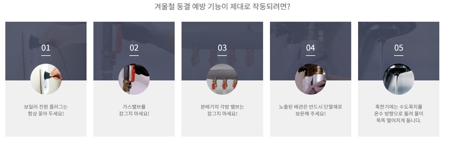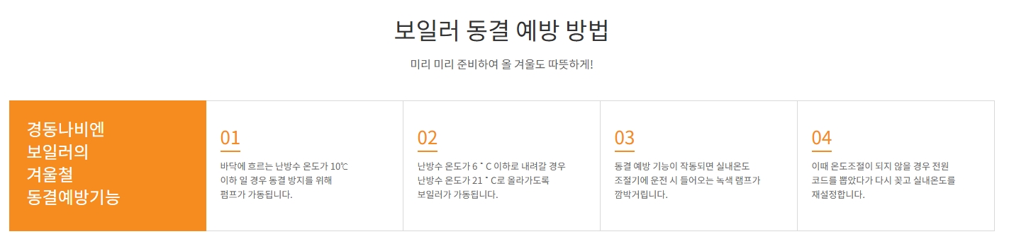 4. 홈페이지 하단에서 겨울철 동결 예방 관련 정보를 확인합니다. 동결 예방 기능에 대한 상세 설명이 포함되어 있으며, 예를 들어 바닥 난방수가 10℃ 이하로 내려가면 동결을 방지하기 위해 펌프가 작동하는 등 보일러의 안전한 사용을 위한 유익한 정보를 제공합니다. 이를 통해 겨울철에도 보일러를 안전하고 효율적으로 사용할 수 있습니다.