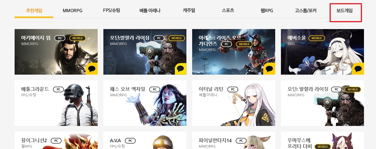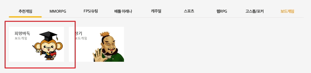 2. 상단 메뉴에서 보드게임 탭을 클릭하세요. 이곳에는 바둑뿐만 아니라 다양한 보드게임들이 나열되어 있어 취향에 맞는 게임을 선택할 수 있습니다. 깔끔한 UI로 인해 누구나 손쉽게 원하는 항목을 찾을 수 있습니다.